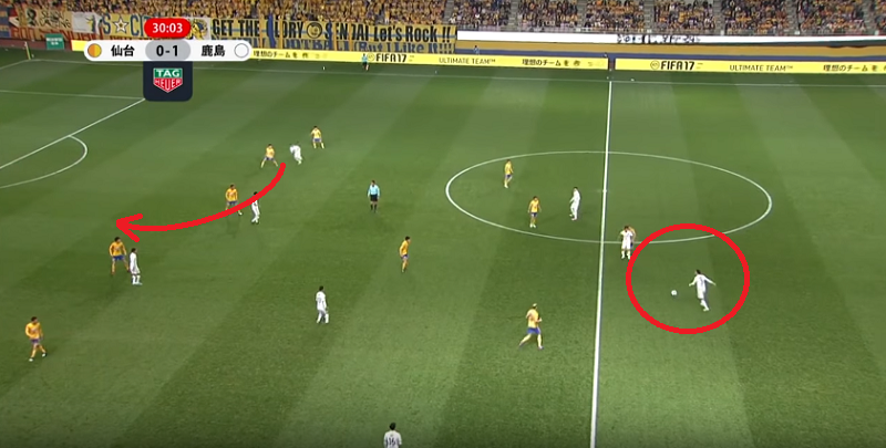 仙台は鹿島戦でも3バックを採用し、このシーンでは真ん中に入ったDF平岡康裕が金崎夢生のマークで釣り出されてしまい、空いた中央のスペースを中村に上手く使われた形だ。