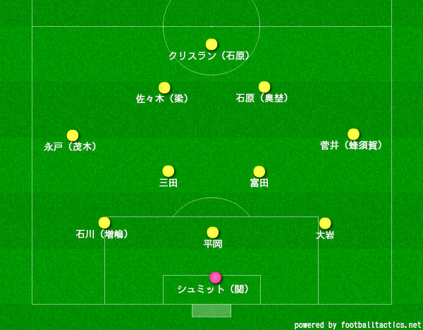 最後尾はシュミット・ダニエルまたは関憲太郎。最終ラインは右から大岩一貴、平岡康裕、石川直樹(増嶋竜也)。ボランチは富田晋伍と三田啓貴で、ウイングバックは右に菅井直樹、左に永戸勝也。シャドーに石原直樹と佐々木匠もしくは梁勇基、奥埜博亮。1トップにクリスランまたは石原が入るのが基本形だ。