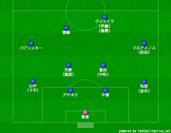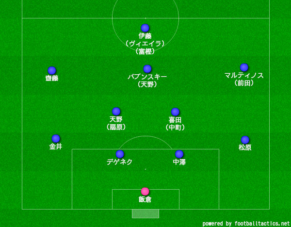 最後尾は飯倉大樹で、4バックは右から松原健、中澤佑二、ミロシュ・デゲネク、金井貢史。ボランチは喜田拓也と天野純、もしくは扇原貴宏。