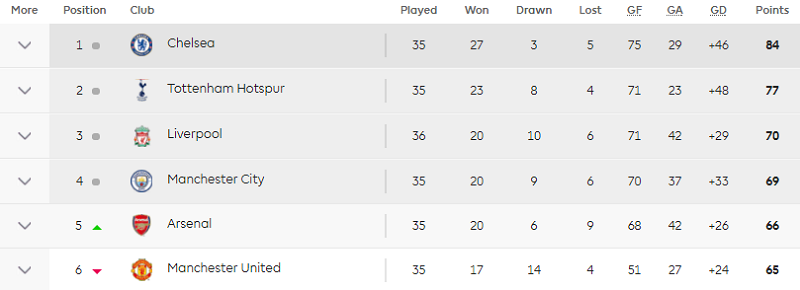 リーグ優勝に関してはチェルシーがほぼ手中に収めている状況だが、UEFAチャンピオンズリーグの出場権を巡る争いは混戦となっている。