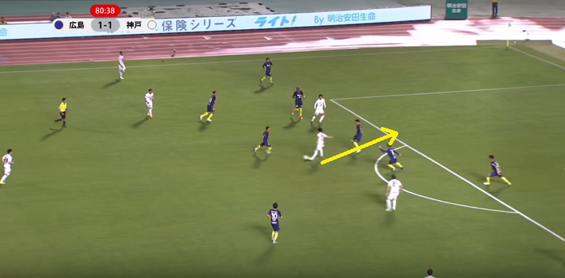 この体勢で、広島DFの間を通すパスコースを描けているのがスゴい…。柿谷曜一朗を彷彿とさせる独特のイマジネーションだ。