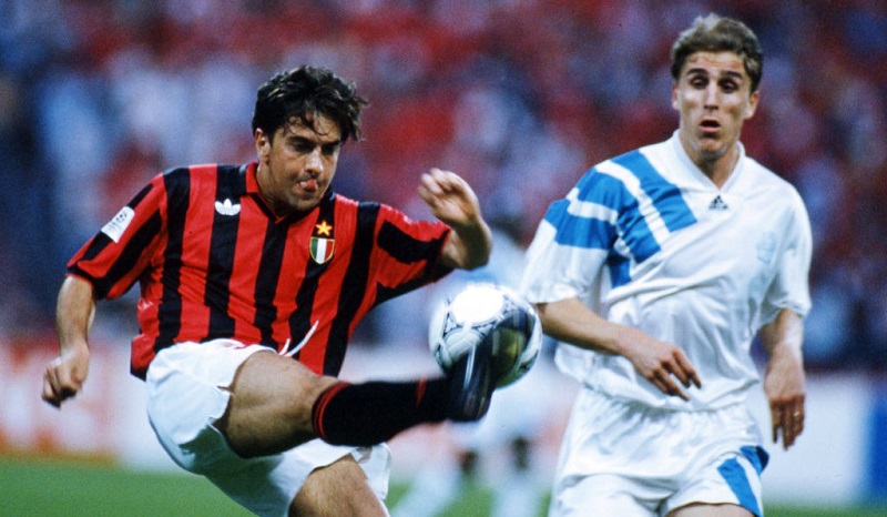 1992-93シーズンのミラン対マルセイユ戦はともにサプライヤーがadidasだったが、ロゴはこの通り違っていた。