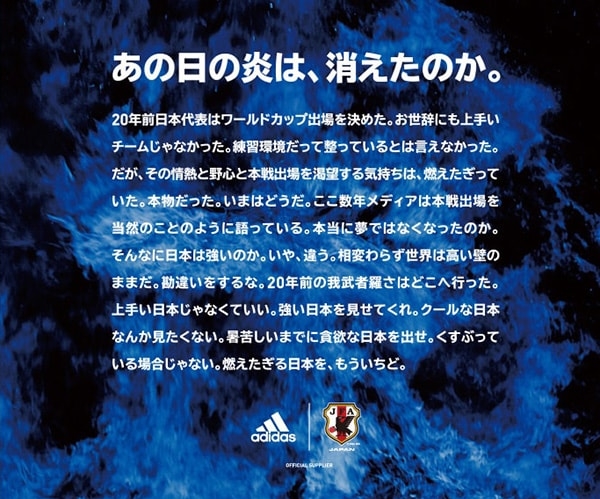 20年前日本代表はワールドカップ出場を決めた。お世辞にも上手いチームじゃなかった、練習環境だって整っているとは言えなかった。だが、その情熱と野心と本戦出場を渇望する気持ちは、燃えたぎっていた。本物だった。いまはどうだ。ここ数年メディアは本戦出場を当然のことのように語っている。本当に夢ではなくなったのか。そんなに日本は強いのか。いや、違う。相変わらず世界は高い壁のままだ。勘違いをするな。20年前の我武者羅さはどこへ行った。上手い日本じゃなくていい。強い日本を見せてくれ。クールな日本なんか見たくない。暑苦しいまでに貪欲な日本を出せ。くすぶっている場合じゃない。燃えたぎる日本を、もういちど。