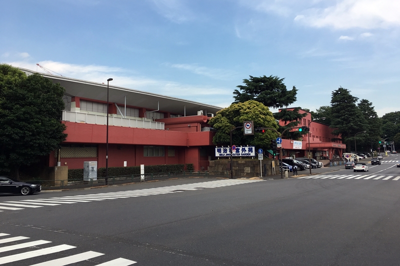 赤い外観が印象的な明治神宮外苑アイススケート場。5月からリンクの張替え工事が行われており、7月16日に営業再開予定とのこと。フットサル場は普通に使えるぞ。