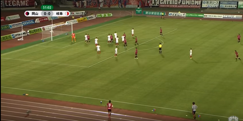 これだけ距離がありながら、すでにゴール前を固めている白のユニフォームを着た岐阜の選手たち…。普通のスローワーではまずありえない光景だ。