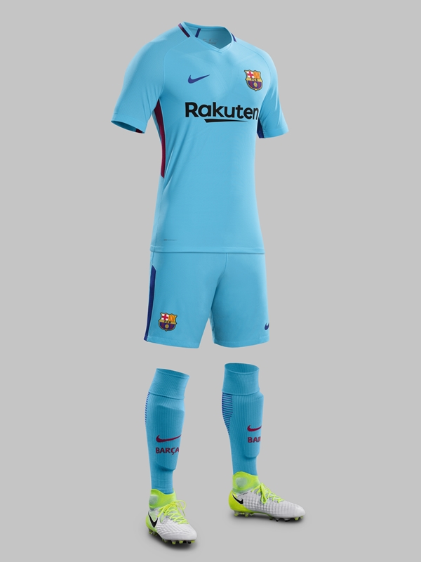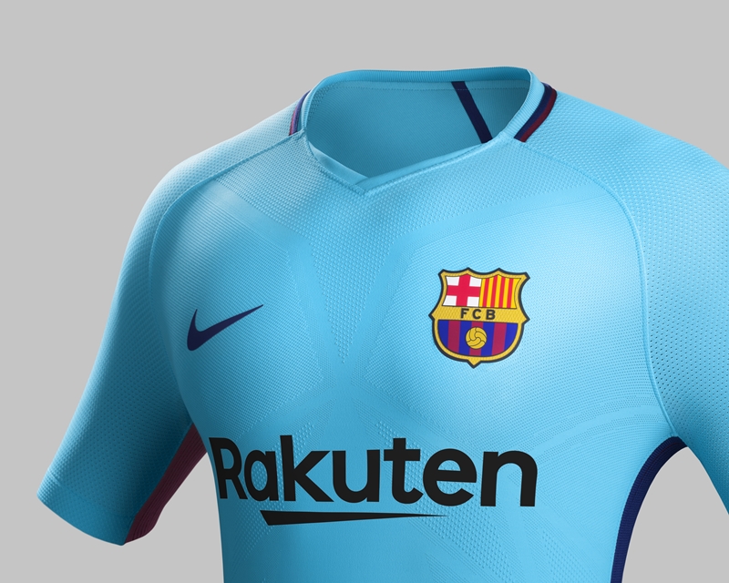 バルサの2017-18アウェイユニフォームは、ベースカラーに水色を採用。首部分にはクラブカラーの“ブラウグラナ”(青とえんじ)のストライプが配されている。