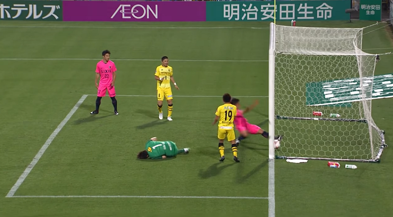 クリスティアーノのシュートをGKクォン・スンテが弾き、ここに中川寛斗が詰めるとボールはゴールの方へ。しかし、これに対して永木が懸命に足を伸ばしゴールライン上でのクリアに成功した。
