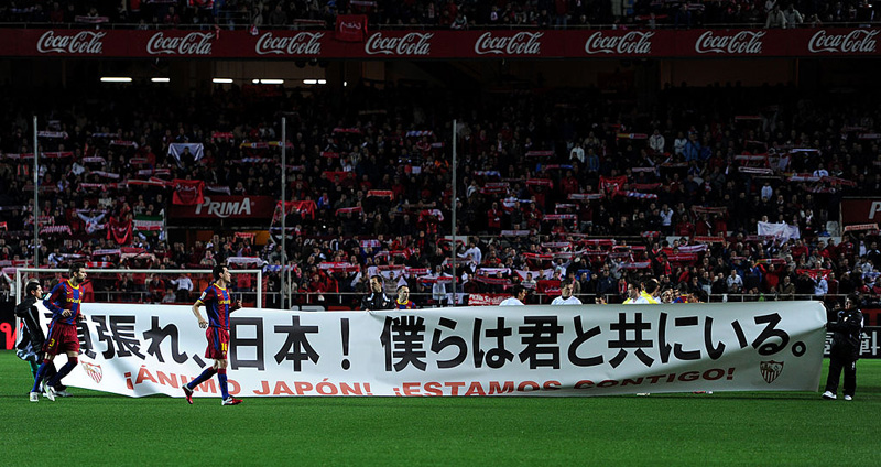 セビージャが用意した、東日本大震災の被災者へのメッセージが書かれた横断幕を、両チームの選手が掲げてピッチへ入場。この光景に思わず涙したフットボールファンも多かったと思う。
