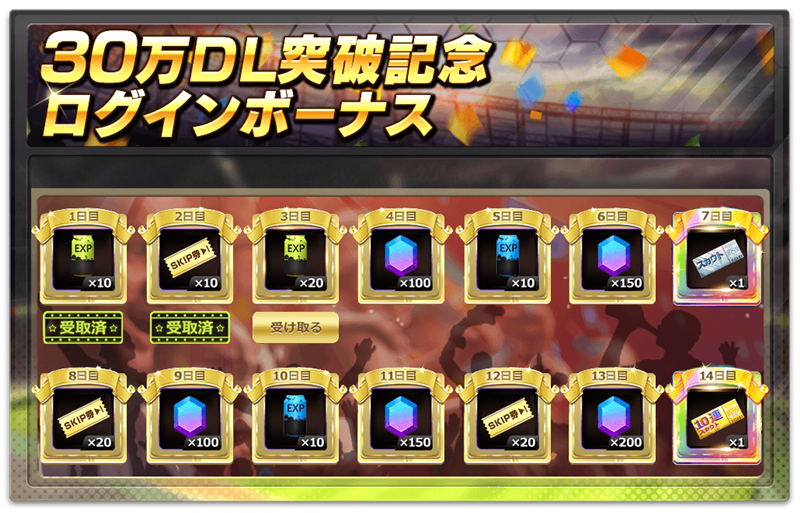 30万ダウンロードを突破したことを記念して行われるログインボーナスは、14日間連続!毎日ログインすると「10連スカウトチケット」がもらえるほか、「合計700ダイヤ(1400円分)」が貰えるなど超豪華な内容となっている。
