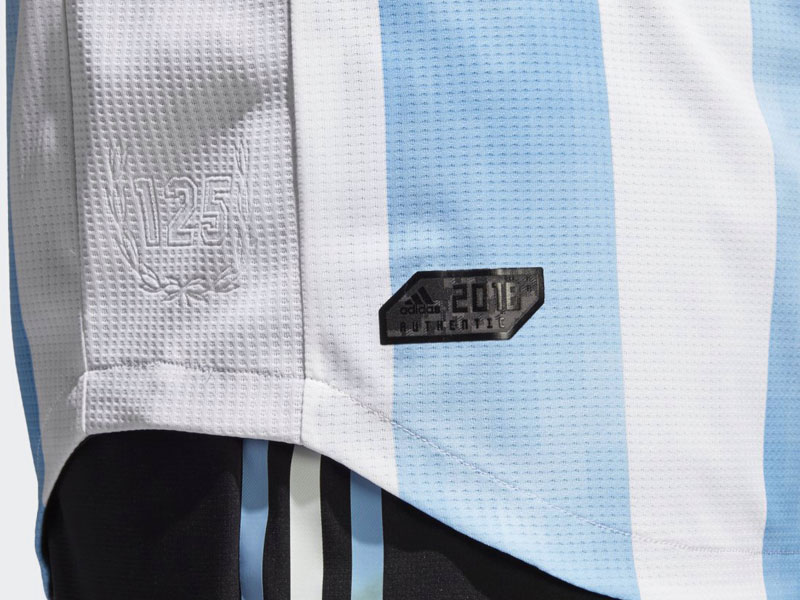 1893年創立のアルゼンチンサッカー協会は、来年で創立125周年を迎える。それを祝してシャツの右裾には、月桂樹の葉で飾った“125”をエンボスでプリントした。その横には“2018”が入ったオーセンティックタグをプリント。