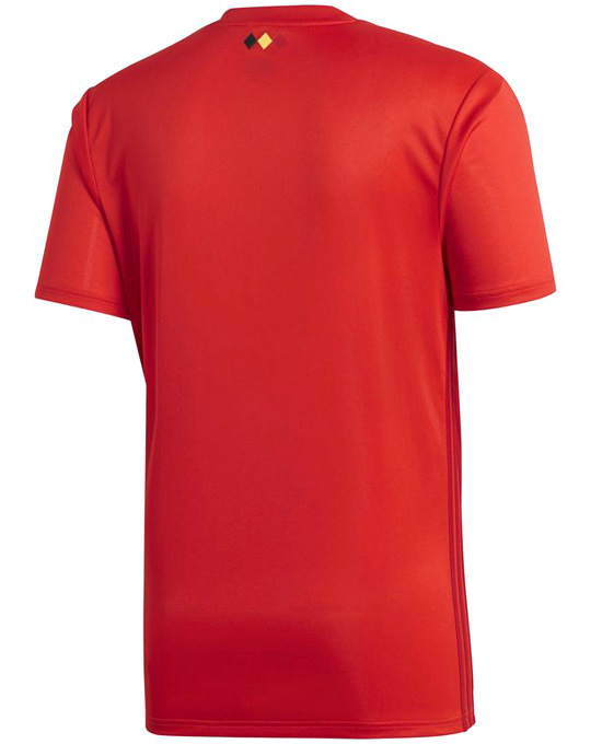 背面の首元にはベルギー国旗色でアーガイル柄をプリント。シャツと同系色のスリーストライプスは脇部分に配している。