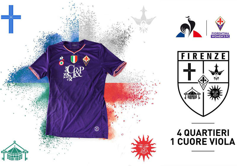 シャツのベースは男子チームのユニフォームと同じで、右脇にはフィレンツェにある4地区のシンボルマークを取り入れている。胸スポンサーは男子チームと異なり、ハンドバッグやアクセサリーを製造するフィレンツェの企業“CF&P”。ロゴデザインが綺麗で、このユニフォームによく合っている。