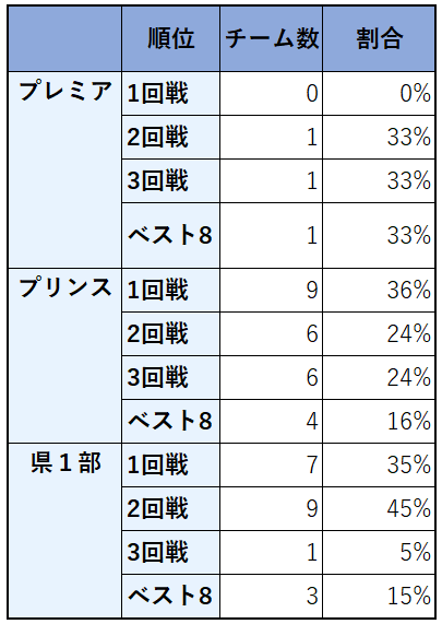 一方で、所属リーグごとにどこまで勝ち進んだことを見てみると県リーグのチームは2回戦までに20チーム中16チーム(80%)が敗退している。プリンスリーグは25チーム中15チーム(60%)、プレミアは3チームしか出場していないが1チーム(33%)のみ2回戦敗退とやはり上位に勝ち進むのは上位のリーグでプレーしている高校という傾向はある。