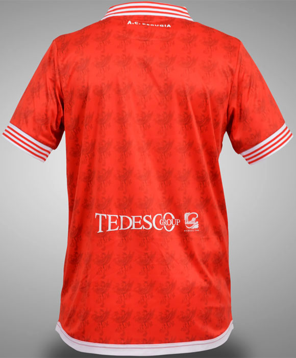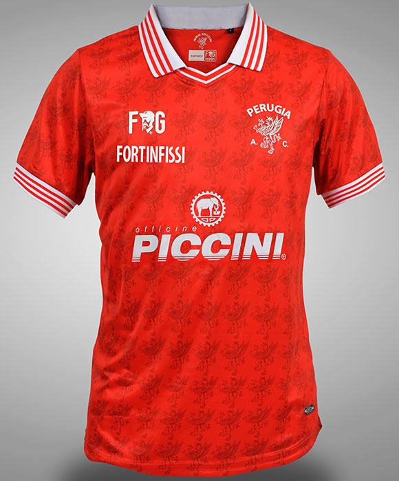 伝統のレッドを基調としたホームユニフォーム。エンブレムにも使われているグリフォンが全体にプリントされている。ゾウのロゴマークが可愛い胸のスポンサー“Officine Piccini”は建設機材の会社。