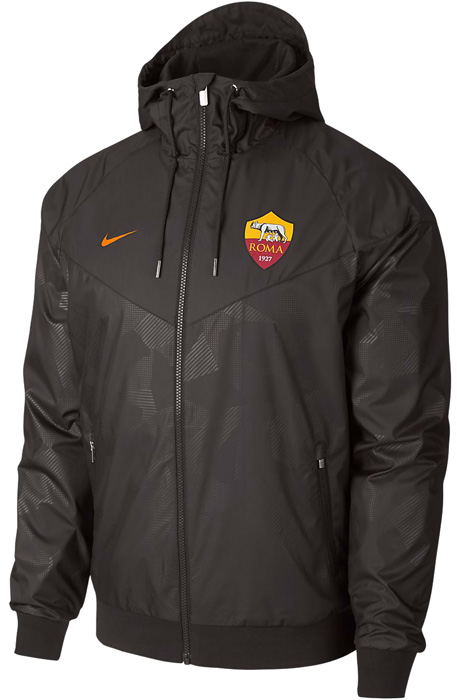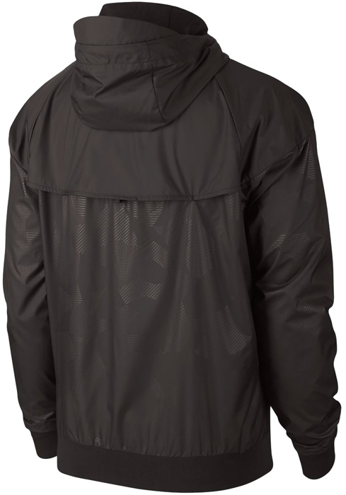 濃いブラウンを基調としたウィンドランナージャケットで、色と幾何学模様デザインは今季のサードユニフォームと同じ。“ヴィヴィッドオレンジ”はスウッシュ(Nikeロゴ)部分に使われている。
