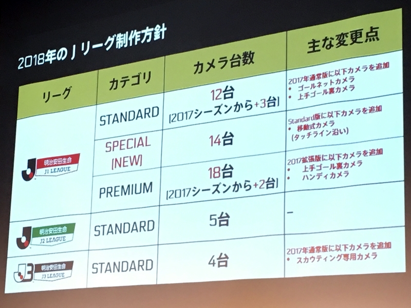 サッカー関連では、Jリーグ中継の制作方針が明らかとなり、特にJ1はカメラの数がさらに増加している。