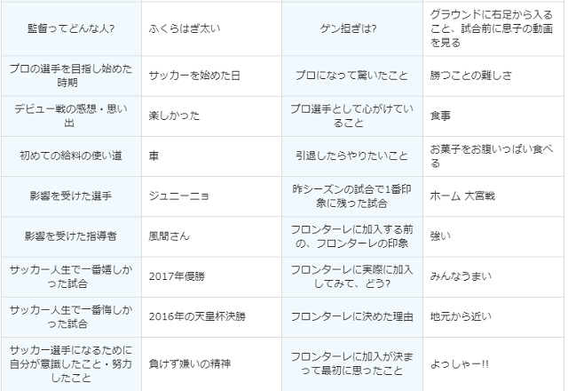 「サッカーに関しての自分の武器」や「サッカーを始めたきっかけ」といった定番の内容から、「サインの理由・内容」などの人となりが窺えるもの、さらには「最初に買ったCD」や「お気に入りのLINEスタンプ」など質問内容は多岐にわたり、その質問数は全部で206!