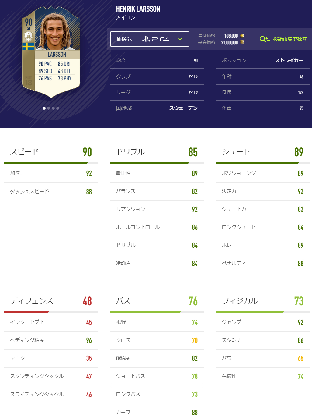 アルティメットモード内に登場する彼の能力値を見てみよう。なお、アイコン選手にはそれぞれ3タイプが用意されており、ラーションの場合は総合値90・86・87の3つ。ここで、能力値90のものを見てみる。