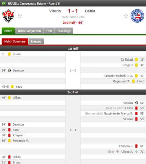 後半34分までにヴィトーリア側に5人、バイーア側に4人の退場者が出たことで、主審は試合の打ち切りを決めたとのこと。『flashscore』で見るとこの通り。
