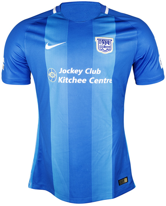 伝統のブルーだが今季はストライプを採用したホームキット。漢字のエンブレムがシンプルでストレートだ。胸スポンサーの「Jocky Club Kitchee Centre」は、香港の競馬競技団体(日本のJRAに相当)。