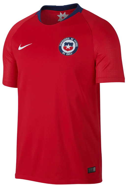 前モデルと同じく、レッドをベースにブルーの差し色を配したシンプルなデザイン。右胸のスウッシュ(Nikeロゴ)はホワイトで彩り、この3色でチリ国旗カラーとなる。