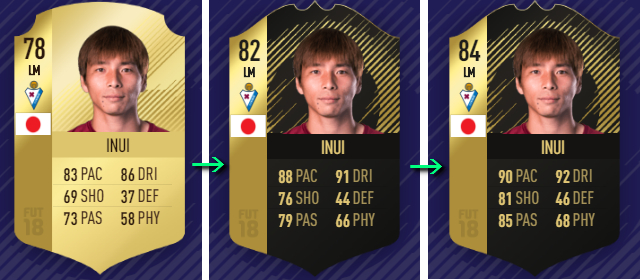 乾は今季2度目となるTOTW選出で、通常の能力からこんな感じにアップしている。