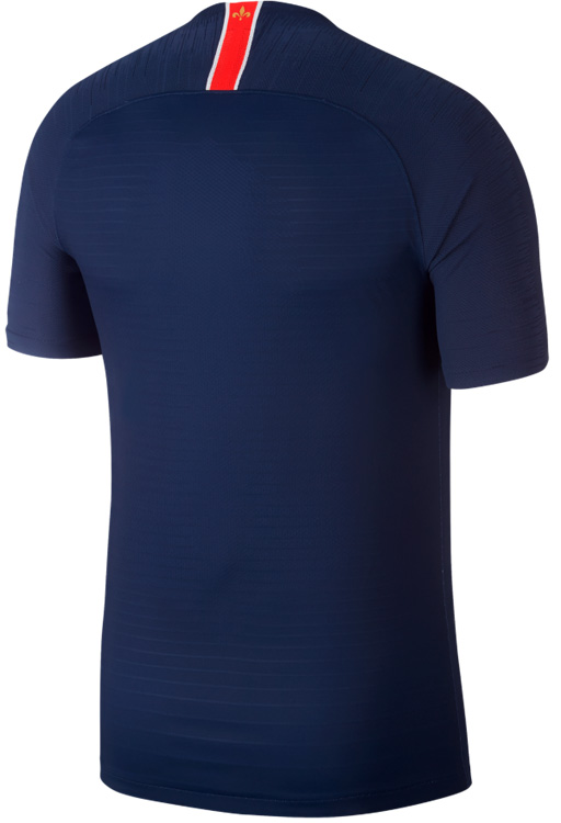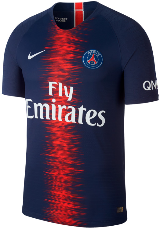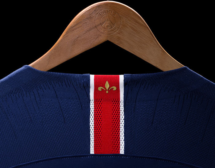 基本的なデザインは変わらず、いつも通りのネイビーを基調にレッドの縦ライン。2017-18モデルは極細だった縦ラインは太めが復活した。今回のラインは「パルク・デ・プランスのノイジーなサポーター」にインスピレーションを得て、それをサウンドウェーブ(音波)のようなグラフィックでデザインしている。