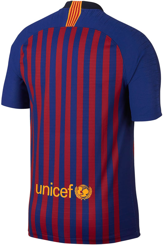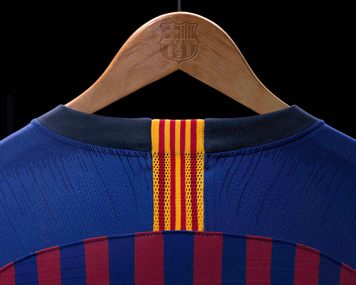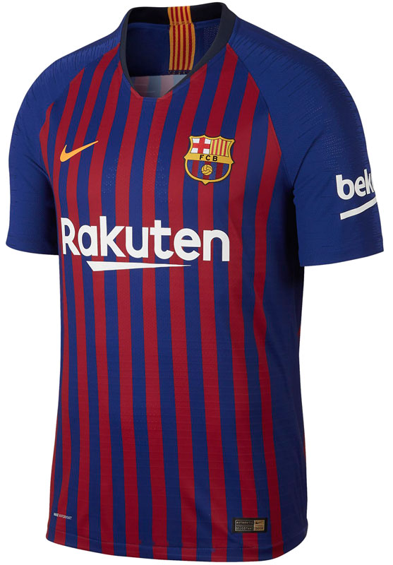新しいホームキットは2017-18モデルとは異なり、幅が均等のストライプをあしらったクラシックなスタイル。10本のエンジのストライプはバルセロナ市の10地区を表現している。胸スポンサー「RAKUTEN」と左袖スポンサー「beko」に変更はない。