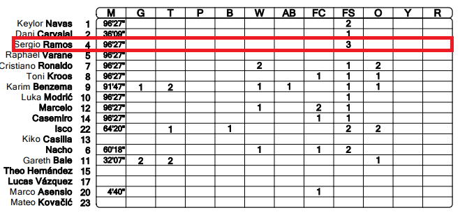 セルヒオ・ラモスはこの試合でチームトップとなる3度のファウルを受けた一方、自らは一度もファウルをとられなかったようだ。