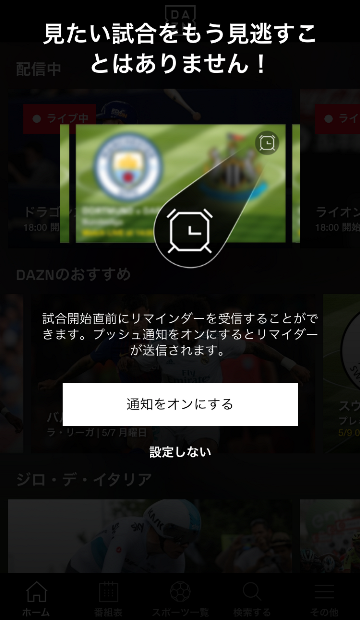 スポーツチャンネルの『DAZN(ダゾーン)』は5月29日、新機能として設定した試合の放映開始を事前にプッシュ通知で知らせる「リマインダー機能」の搭載を発表した。
