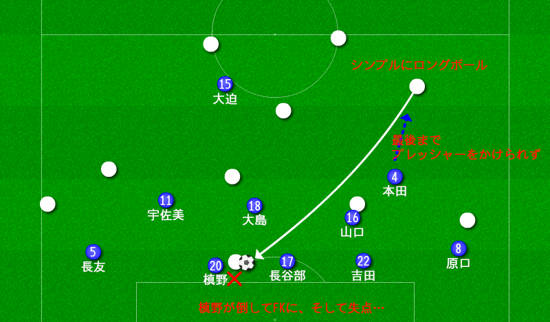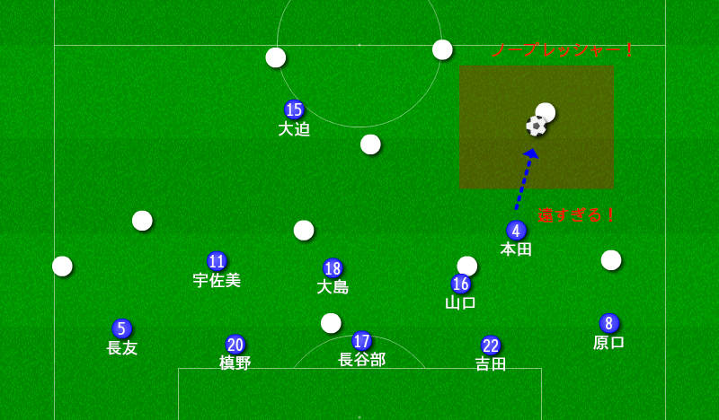 このシチュエーションにおけるポジションを考えると、本田圭佑がボールを奪いに「圧」を掛けるべきであったが、その判断が遅れ、動き出しも鈍重。最終的にガーナの選手は「ノープレッシャー」でロングボールを蹴られる環境を獲得。