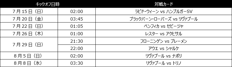 昨シーズンCL準優勝のリヴァプールがセリエAのナポリ、トリノと対戦する8月5日(日)、8日(水)の配信もファンにとっては見逃せない試合だ。