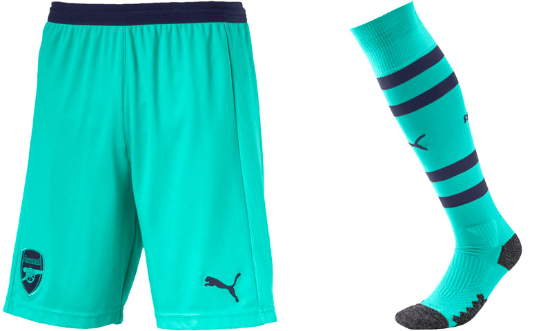 パンツはグリーンを基調にネイビーの差し色。ソックスも同じくグリーンを基調にネイビーのフープをあしらい、前面にはPumaのキャットロゴ、背面にはチーム名“ARSENAL”のグラフィックが入る。