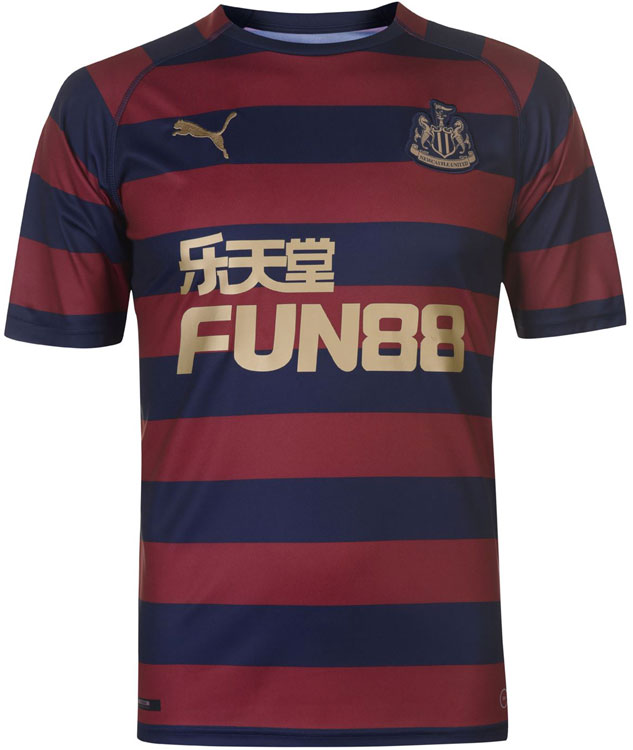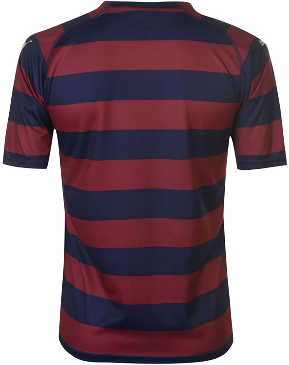 新しいウェイキットは、エンブレムやスポンサーロゴをゴールドで統一。マルーン/ダークブルーの水平ストライプに懐かしさを覚えるこのデザインは、1995-96シーズンのアウェイキットにインスパイアされている。