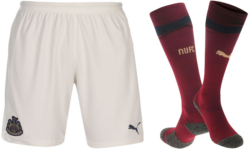パンツの色はクリーム、ソックスはシャツと同じマルーンを基調。ソックスの前面にはPumaキャットロゴ、背面にはチーム名の略称“NUFC”のグラフィックが入る。