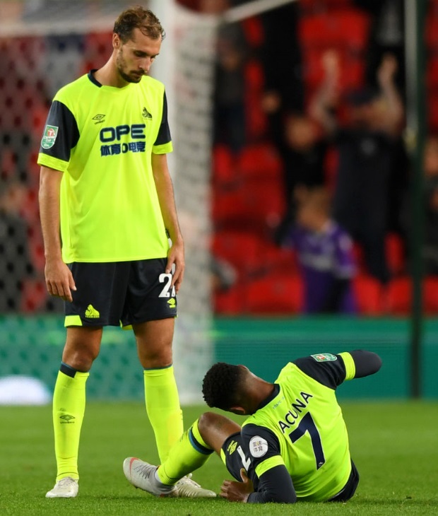 How about this for a nightmare debut? Huddersfield's Bacuna lobs his own goalkeeper from 50 YARDS... and then hobbles off injured to cap night to forget https://t.co/fQNQhqinD8 pic.twitter.com/lIdTAYsuZs