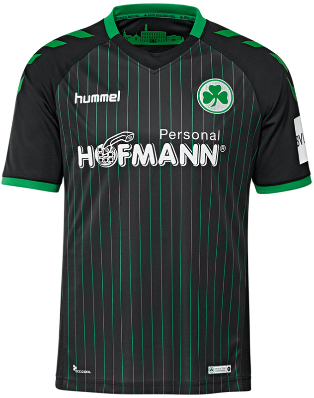 新しいアウェイキットはグリーンを基調に、胸から下の水平ストライプが特徴的なデザイン。首元の内側にはフュルトの街のスカイライン(空を背景とした建築物の輪郭線)を描く。