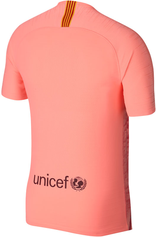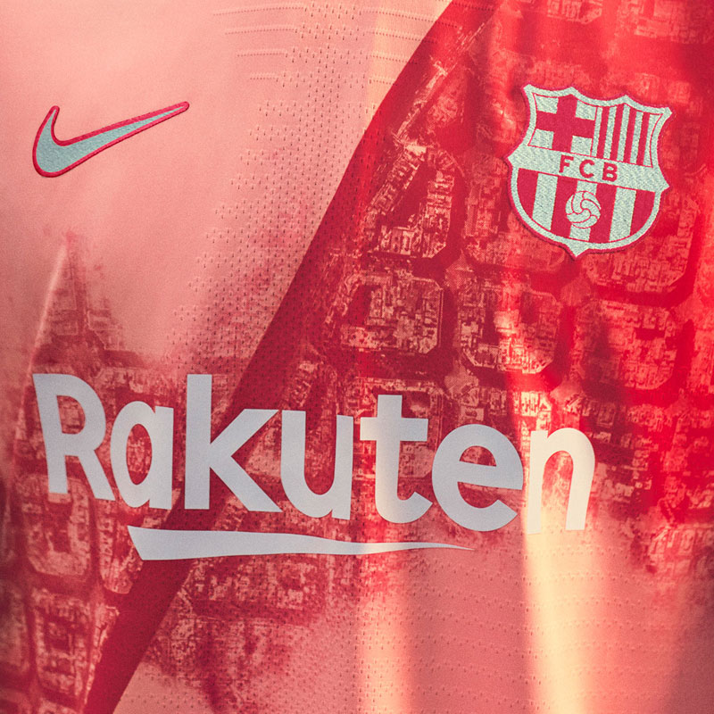 新しいサードキットは濃淡が異なる2色のピンクを基調。この系統の色は2009-10シーズンのアウェイキット以来となる。左肩から右裾にかけての斜めラインは、バルセロナの街を代表する「ディアゴナル大通り」にインスパイアされている。