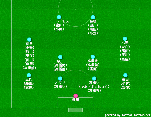 F・トーレスと金崎が加わった後半戦は、この2トップを戦術の軸に据え、4-3-1-2と4-4-2を採用。
