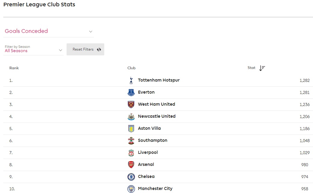 そうした中、スパーズはプレミア史上最多失点チームになったと話題になっている。実際にプレミアリーグ公式サイトにて、「失点数・全シーズン」でソートしてみたところ…。