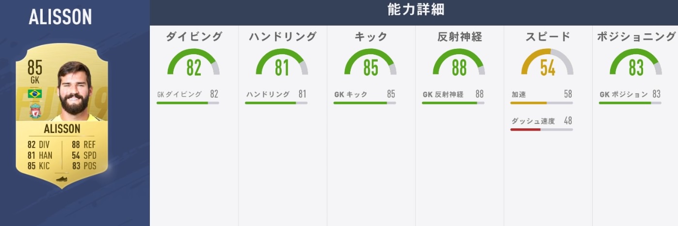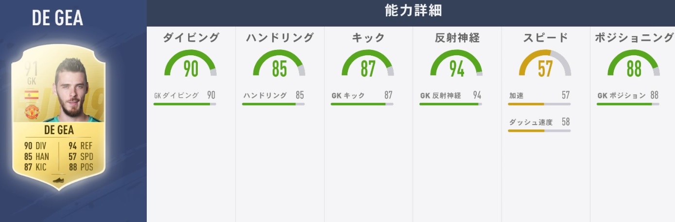 画像では見えにくいが、デ・ヘアの総合値は91。ゲーム上では彼が最強GKのひとりとなっているが、最近の勢いではアリソンのほうが上か。