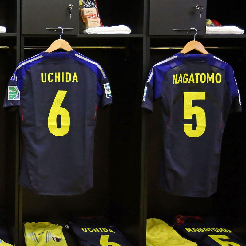 2013年のコンフェデ杯は、通常のホワイトではなくイエローの特別なネームナンバーで大会に臨んだ。画像はメキシコ代表戦前、ドレッシングルームに用意されたユニフォーム。長友佑都のシャツは「TECH FIT(テックフィット)」だ。