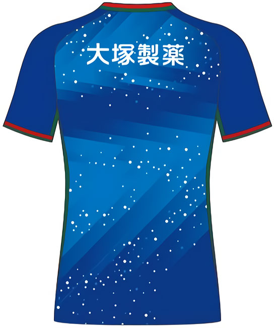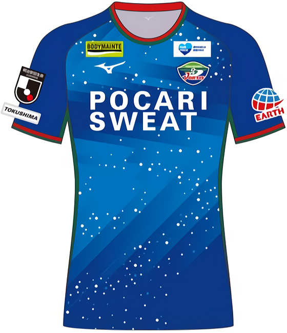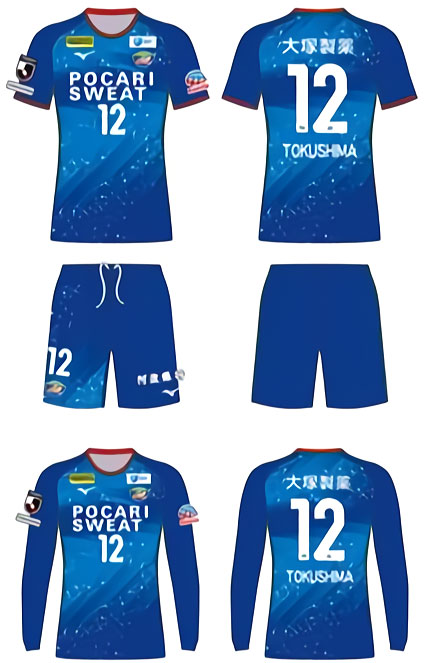 シャツはクラブカラーで彩り、渦潮や藍に代表される徳島の「ブルー」をベース。そして眉山に代表される自然の「グリーン」、そして情熱の「レッド」を差し色に使う。
