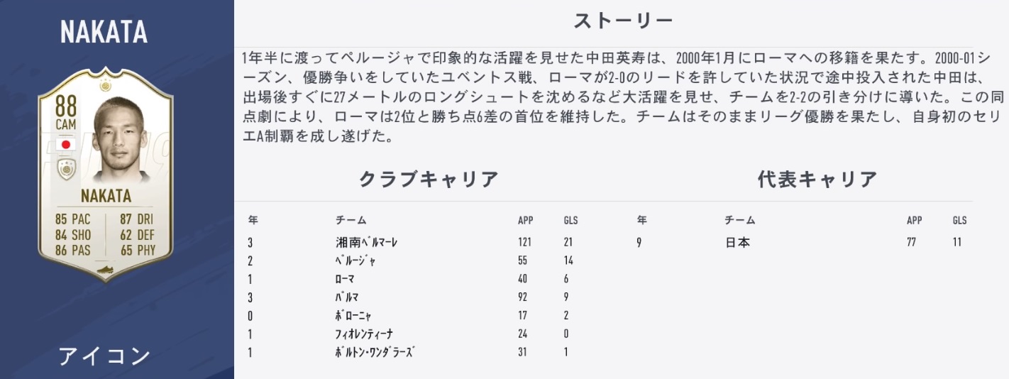 アルティメットモード内に現れる「ICON」選手たち。日本が誇るレジェンドである中田英寿氏も登場したぞ!