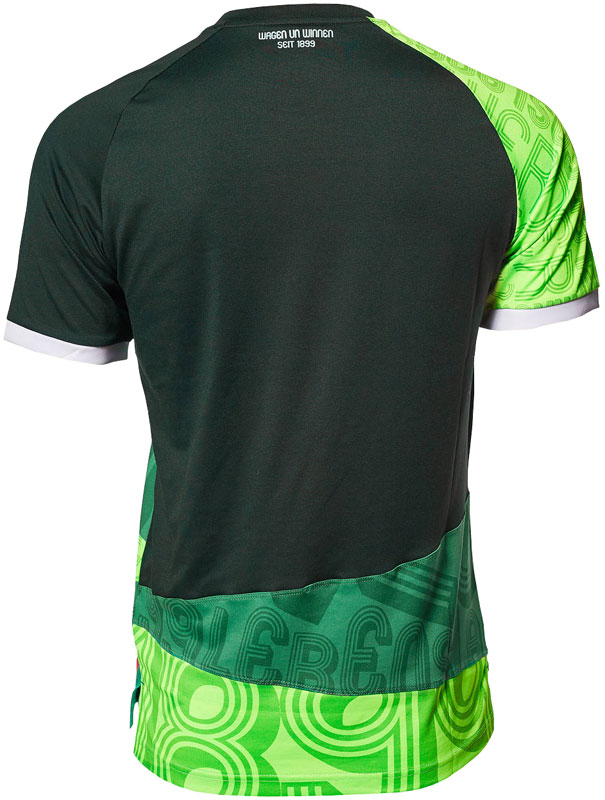 記念すべき120周年記念キットは、いくつものパーツを縫い合わせたマッシュアップジャージに。各パーツにはスローガンなど、クラブに関するワードがプリントされている。濃淡のグリーンは過去のユニフォームに使われた色で、ブレーメンの歴史そのもの。