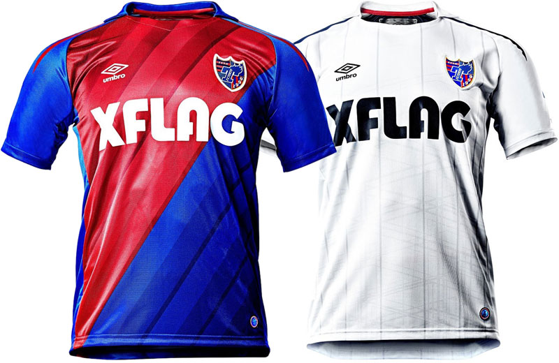 FC東京のユニフォームは、ホームは大胆なアシンメトリーデザイン。矢印の先端に見立てたグラフィックで「さらなる進化」を表現している。スポンサーは今季から『XFLAG(エックスフラッグ)』に。