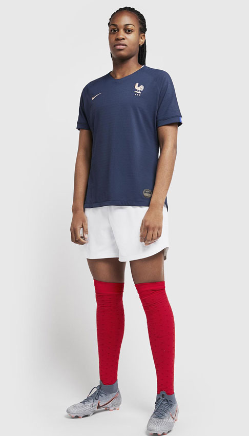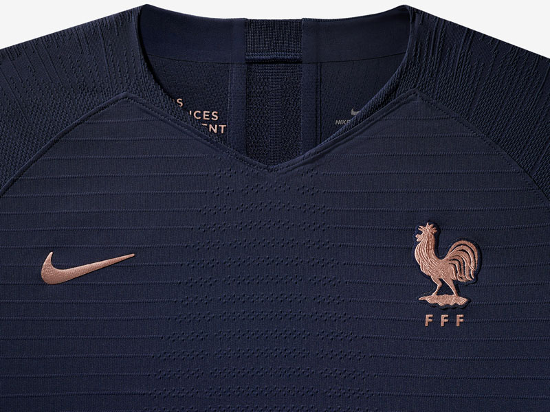 エンブレムとNikeロゴ(スウッシュ)は、ややピンクの入ったローズゴールドで彩り、開催国のチームらしく華やかさを演出。なお背面には、フランスサッカー連盟の略称“FFF”をレタリングする。