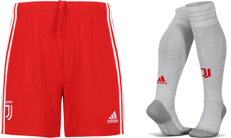 パンツはレッドを基調に、スリーストライプスにはホワイトの差し色。画像だとグレーのようにも見えるソックスだが、実物の色はホワイト。前面にはチームエンブレムが入る。