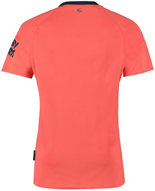 NEWアウェイキットはコーラル(珊瑚色)を基調に、シャドーで斜めストライプをあしらったデザイン。脇のサイドベンツ部分はダークカラーで彩り、アクセントを付けている。