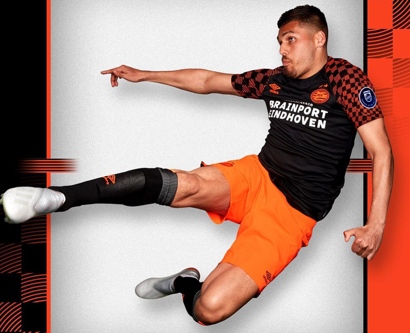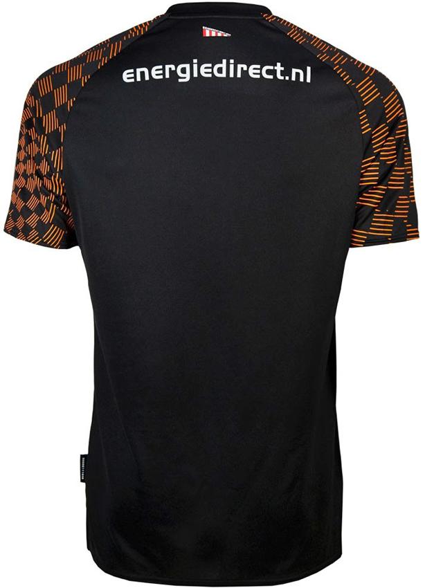 NEWアウェイキットはブラックをベースカラーにオレンジの差し色。袖にはチェッカーフラッグのような市松模様をあしらう。胸のスポンサーは今季から「Metropoolregio Brainport Eindhoven」に変わった。